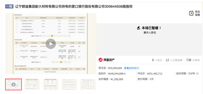 司法拍卖平台显示,辽宁群益集团耐火材料有限公司(以下简称辽宁群益集团)持有的营口银行3.06亿股股权原定于1月24日进行公开拍卖,股权评估价值3.51亿元,折合每股1.15元,起拍价为2.46亿元,较评估价折价约30%,折合每股0.81元。